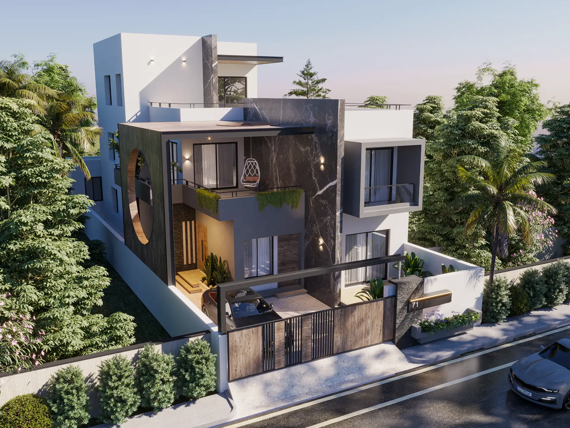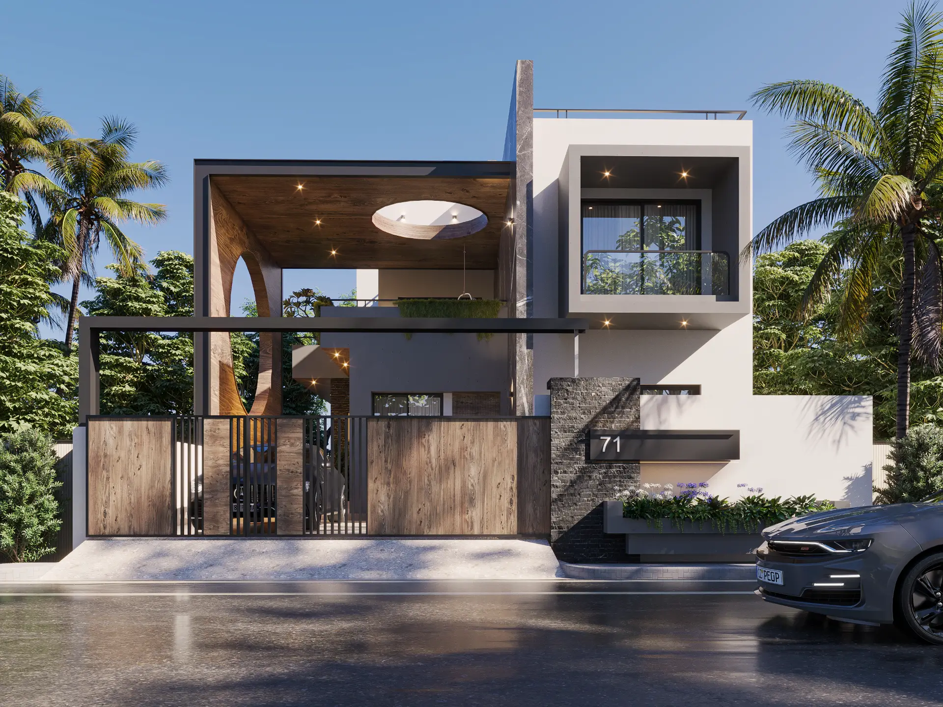 This residence is designed as a modern architectural expression rooted in simplicity and clarity. Defined by clean lines and elemental geometry, the home is thoughtfully oriented to frame uninterrupted views of the lush garden it faces. The spatial arrangement emphasizes openness and connection to nature, with large openings and minimal detailing that allow natural light and landscape to become integral to the living experience.